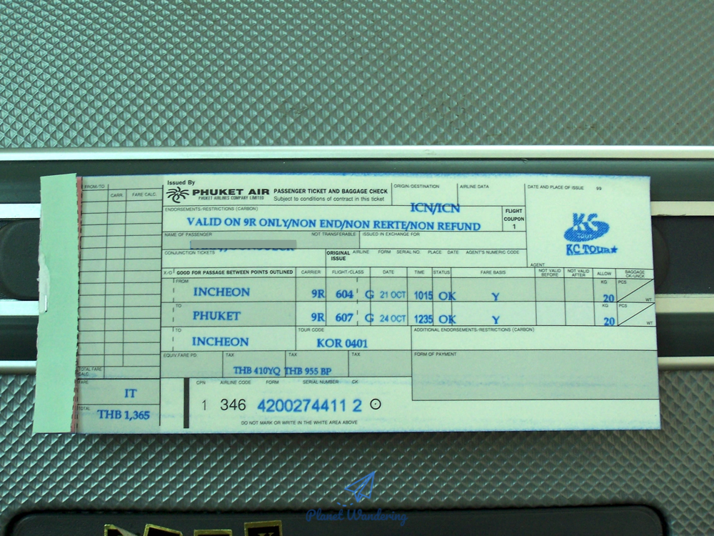 이 사진은 당시의 푸켓여행 여정을 기억하고 있네요. 10월 21일 10시 15분에 인천을 떠나고 3일 후인 24일 12시 35분에 푸켓을 떠나 돌아오는 일정입니다. 클래스는 일반적인 이코노미 클래스인 Y, 짐으로 보내는 수하물은 1인 20킬로그램 기준이었네요. 당시 여행은 3박 4일 일정의 푸껫 패키지여행, 모두투어에서 24만 원에 팔던 패키지 상품으로 떠난 여행이었습니다.