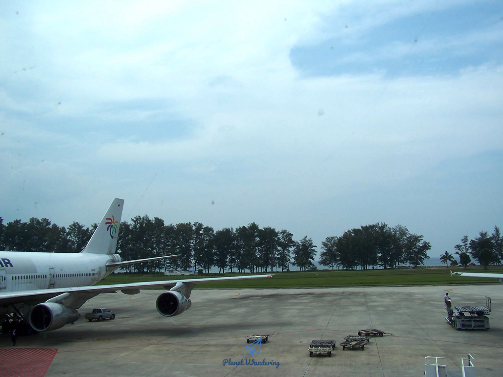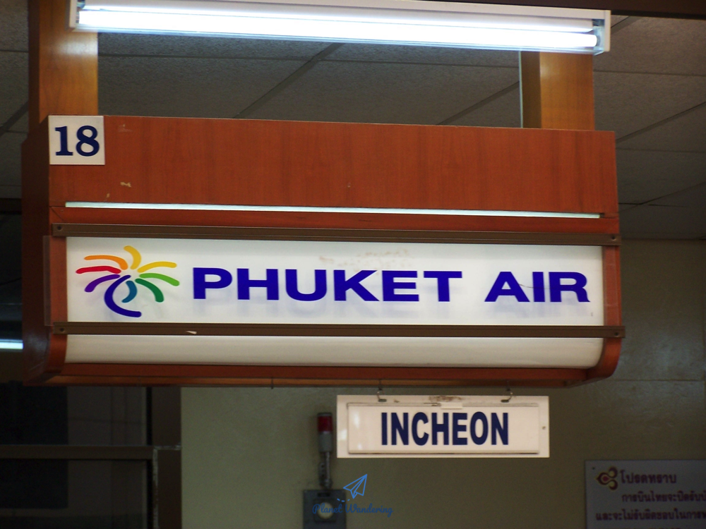 아래 사진은 푸켓에서 우리나라로 돌아오는 길, 푸껫 공항의 푸껫 에어 카운터와 출항 준비를 하는 푸껫항공 보잉 747의 모습입니다.