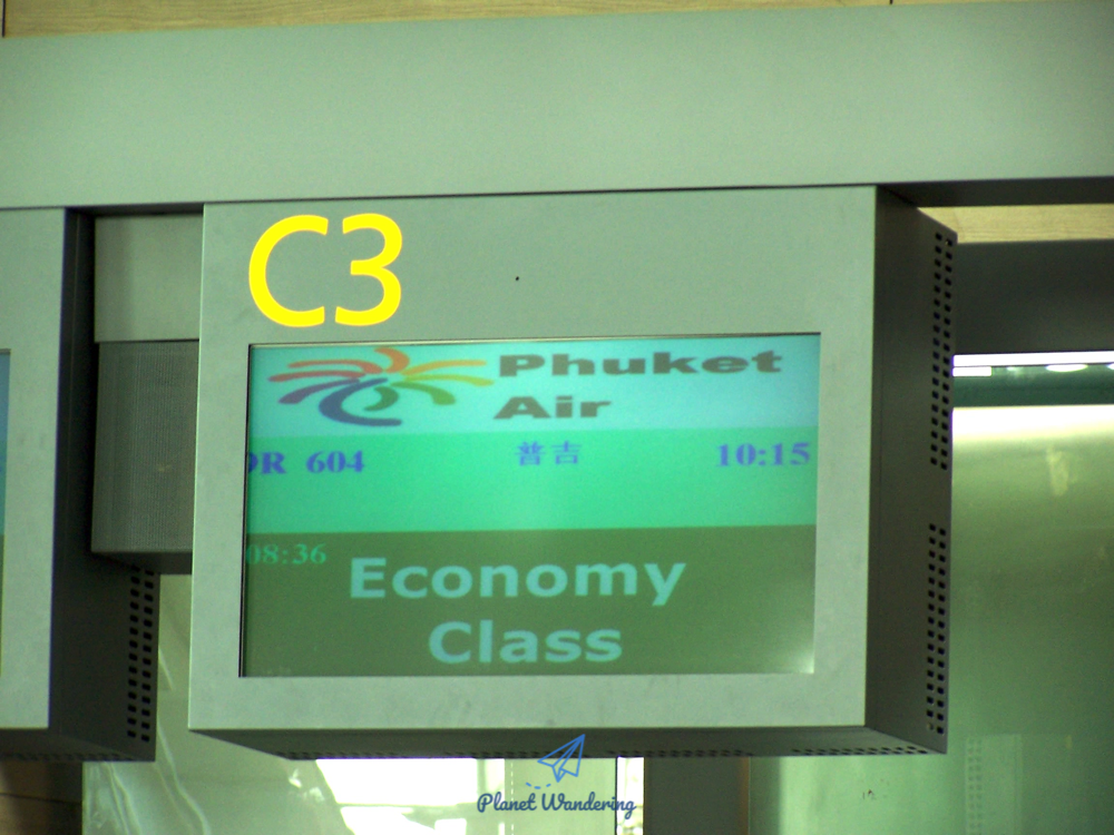 인천공항 체크인 카운터의 푸켓항공 카운터 모습입니다. 당시에는 LCD나 LED 같은 평판 디스플레이가 대중화되기 이전이었기 때문에 육중한 브라운관 모니터가 걸려있었습니다. 사진이 찍힌 시각은 오전 8시 35분, 푸켓항공의 9R 604편은 10시 15분에 푸켓을 향해 출발하는 일정이었고, 푸켓공항까지는 약 6시간 30분이 걸린 것으로 기억됩니다.
