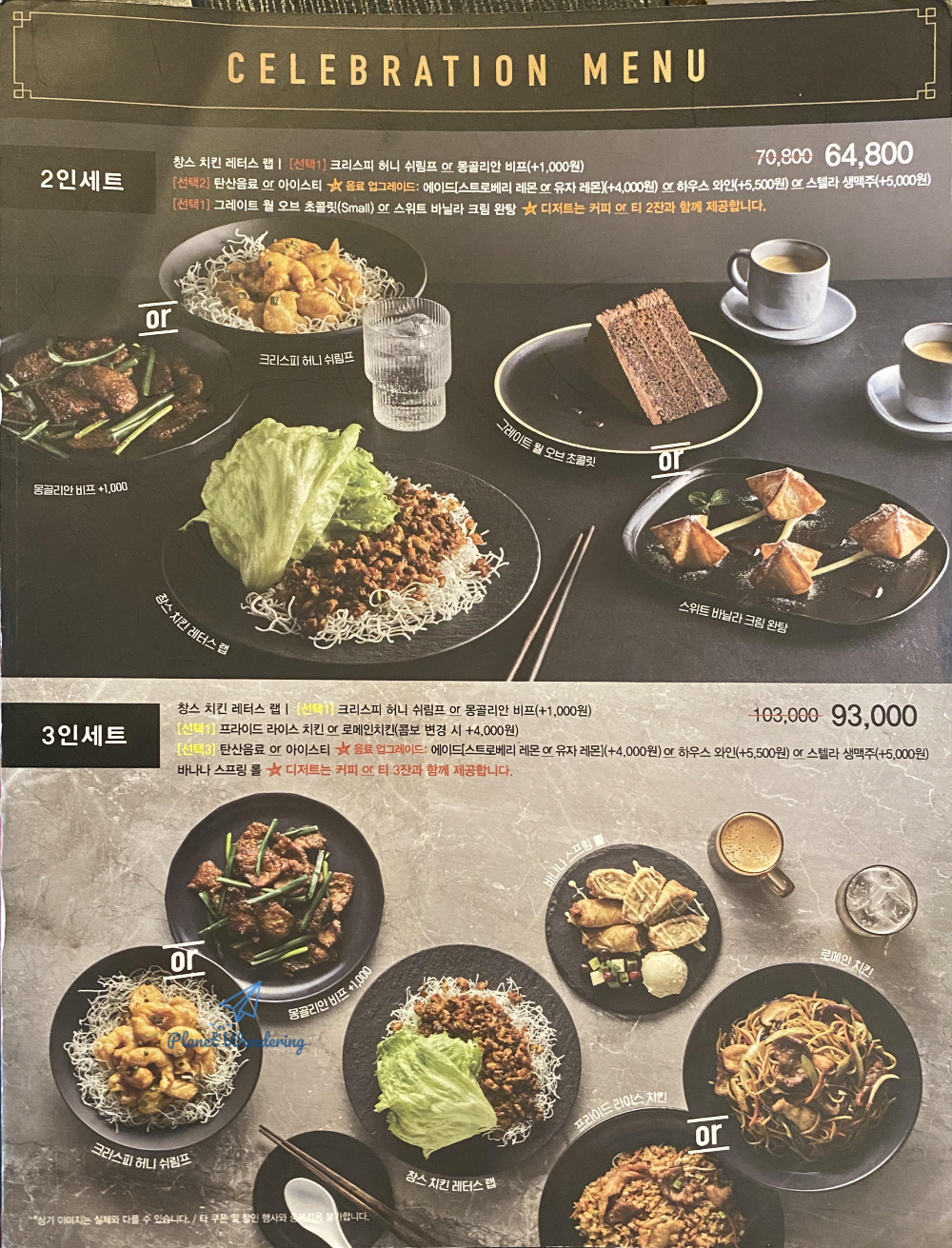 3인 세트를 예로 든다면, 3인 세트는 3종의 요리와 음료, 디저트, 디저트 음료로 구성됩니다. 먼저 [창스 치킨 레터스 랩은 기본]으로 포함되고, 크리스피 허니 쉬림프와 몽골리안 비프 중 하나를 고를 수 있고, 프라이드 라이스 치킨과 로메인치킨 중 하나를 고를 수 있죠. 여기에 탄산음료와 아이스티 중 하나를 고르고 디저트 음료로 나오는 커피와 차 중 하나를 고를 수 있습니다. 3인 세트에서 디저트는 바나나 스프링롤만 선택할 수 있고, 4인 세트에서는 바나나 스프링롤과 그레이트 월 오브 초콜릿 중 하나를 고를 수 있게 되죠. 메뉴 사진의 요리 사이에 표시된 [OR]에 겹쳐진 요리 중 하나를 선택할 수 있습니다.