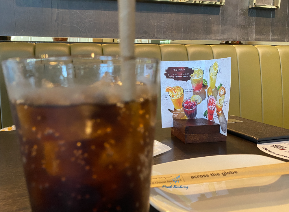 3인 세트를 주문했습니다. 기본이 되는 창스 치킨 레터스 랩과 함께 몽골리안 비프, 로메인 치킨을 주문했죠. 음료는 탄산음료를 주문했는데, 세트 메뉴를 주문하면 탄산음료가 무한 리필되어 편리합니다. 젓가락집에도 전 세계에 300개가 넘는 체인점이 있다고 표시되어 있네요.