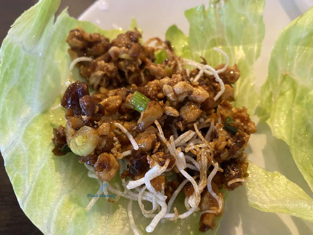 가장 먼저 나오는 창스 치킨 래터스 랩입니다. 다진 닭고기와 버섯 등을 소스와 함께 볶고 바삭하게 튀긴 라이스 스틱과 함께 양상추에 싸 먹는 일종의 쌈 요리입니다. 처음 보면 어떻게 먹는 거지, 약간 당황감이 밀려오기도 하죠. 피에프창에서 말하는 창스 치킨 래터스 랩 먹는 방법은 먼저 양배추를 한 장 뜯어 손에 올리고 닭고기 볶음 한 스푼과 라이스 스탁 약간을 양배추 위에 올란 다음, 소스를 살살 뿌려 한 입에 양배추 쌈으로 먹는 겁니다.