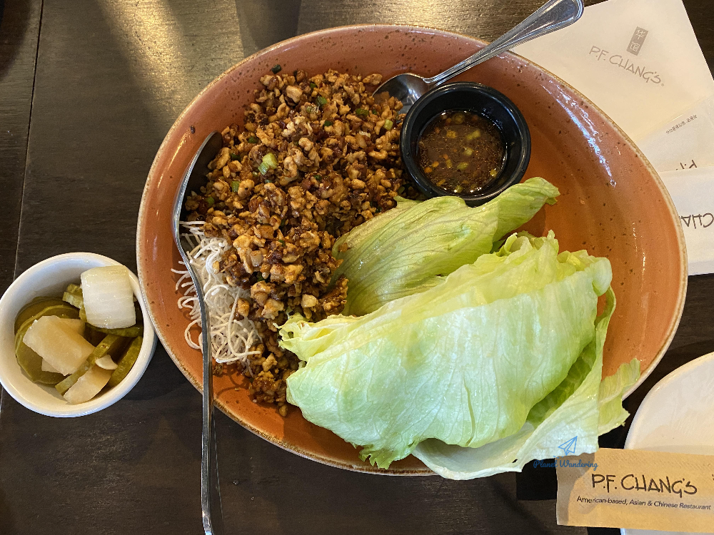 가장 먼저 나오는 창스 치킨 래터스 랩입니다. 다진 닭고기와 버섯 등을 소스와 함께 볶고 바삭하게 튀긴 라이스 스틱과 함께 양상추에 싸 먹는 일종의 쌈 요리입니다. 처음 보면 어떻게 먹는 거지, 약간 당황감이 밀려오기도 하죠. 피에프창에서 말하는 창스 치킨 래터스 랩 먹는 방법은 먼저 양배추를 한 장 뜯어 손에 올리고 닭고기 볶음 한 스푼과 라이스 스탁 약간을 양배추 위에 올란 다음, 소스를 살살 뿌려 한 입에 양배추 쌈으로 먹는 겁니다.