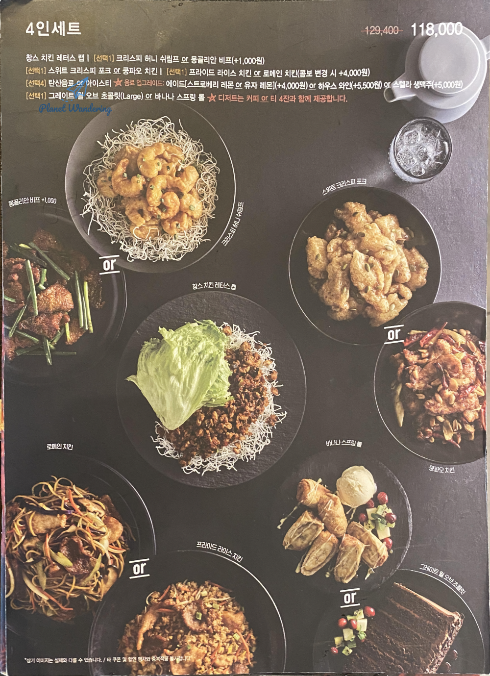3인 세트를 예로 든다면, 3인 세트는 3종의 요리와 음료, 디저트, 디저트 음료로 구성됩니다. 먼저 [창스 치킨 레터스 랩은 기본]으로 포함되고, 크리스피 허니 쉬림프와 몽골리안 비프 중 하나를 고를 수 있고, 프라이드 라이스 치킨과 로메인치킨 중 하나를 고를 수 있죠. 여기에 탄산음료와 아이스티 중 하나를 고르고 디저트 음료로 나오는 커피와 차 중 하나를 고를 수 있습니다. 3인 세트에서 디저트는 바나나 스프링롤만 선택할 수 있고, 4인 세트에서는 바나나 스프링롤과 그레이트 월 오브 초콜릿 중 하나를 고를 수 있게 되죠. 메뉴 사진의 요리 사이에 표시된 [OR]에 겹쳐진 요리 중 하나를 선택할 수 있습니다.