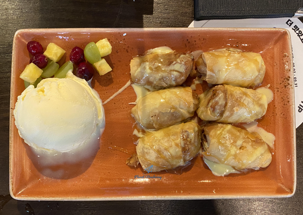 요리 메뉴가 다 지나가고 마지막에 나오는 디저트 바나나 스피링 롤입니다. 바삭하게 튀긴 바나나롤과 아이스크림, 과일이 함께 나오는 피에프창의 대표적인 디저트라는군요. 춘권 피 같은 얇은 껍질 안에 바나나가 들어있고 그 위로 달콤한 소스가 뿌려져 나옵니다. 처음에는 좀 뜨거워서 조심해 드셔야 하죠. 바나나 스프링 롤을 먹다 보면 아이스크림이 녹어버리니 아이스크림을 먼저 드세요~.