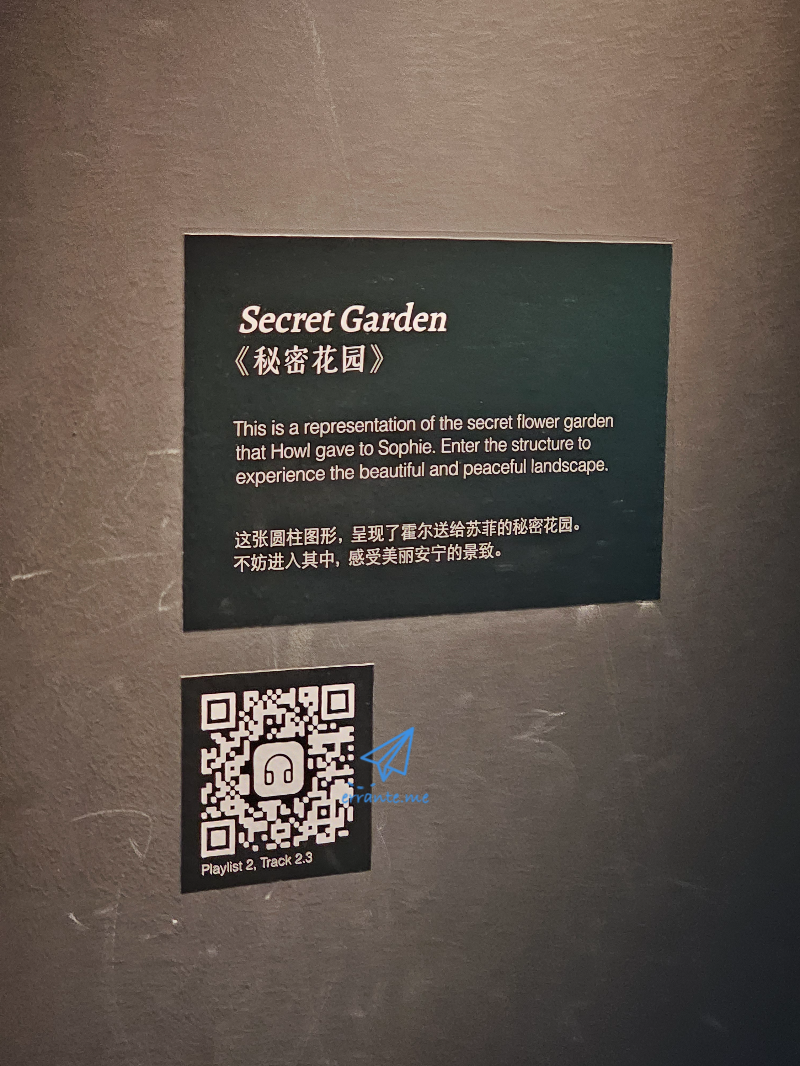 하울이 소피에게 자신의 정원을 보여주며 나누던 대화가 적혀 있는 원통 안으로 허리를 숙여 들어가면 예쁜 풍경이 파노라마 뷰로 펼쳐집니다.