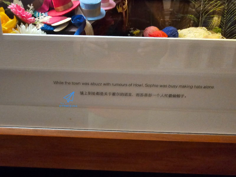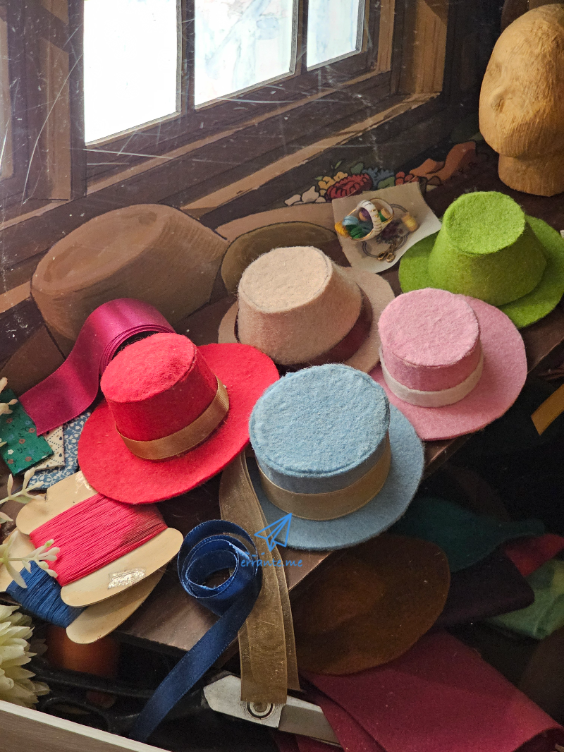 액자 속 모자와 재료들은 아주 작은 크기로 만들어져 있지만 실물 크기의 모자를 들여다보는것처럼 사실감이 넘칩니다. 액자에는 [도시는 하울에 대한 소문으로 떠들썩하지만, 소피는 혼자 모자를 만들기에 바쁘다]라는 설명이 붙어있습니다.