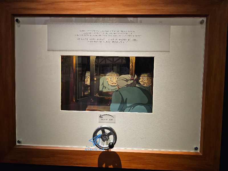 황야의 마녀가 저주를 내린 탓에 소피는 순식간에 90살 노파의 모습으로 변합니다. 할머니로 변한 거울 속 자신의 모습을 들여다보며 놀란 소피의 표정을 움직이는 그림으로 볼 수 있습니다. 액자 밑 손잡이를 돌리면 그림이 한 장씩 넘어가며 소피의 놀란 표정이 움직임으로 구현됩니다.