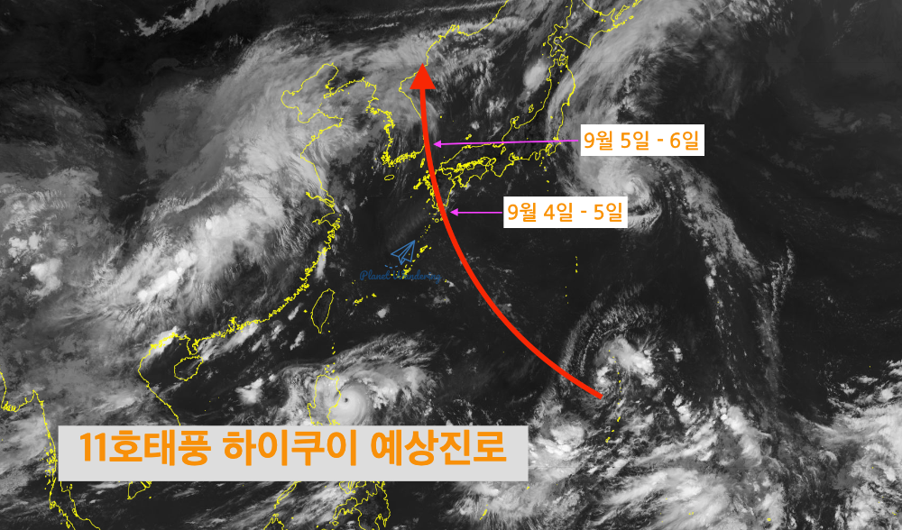 매우 이른 예측이긴 하지만, 일본 남부지방에 다다를 때의 11호 태풍 하이쿠이의 중심기압은 950헥토파스칼, 부산에 다다를 때의 중심기압은 960헥토파스칼로 매우 강한 위력을 갖고 있을 수 있으며 많은 비를 뿌릴 것으로 예상됩니다.