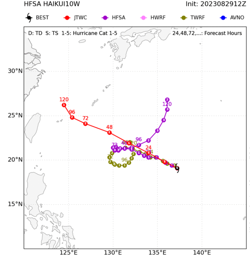 JTWC, 일본기상청과 전혀 다른 진로를 예측하는 모델도 있습니다. 미국대기해양청 NOAA의 HFSA 모델은 태풍 하이쿠이가 앞으로 약 이틀 후 방향을 180도 틀어 다시 일본 큐슈를 향해 북상할 것이라는 전망을 내놓고 있습니다. 타이완 기상청 예측모델 TWRF도 HFSA와 유사하게 태풍 하이쿠이가 한 바퀴 원을 그리며 진행방향을 바꿀 것이라 예상하고 있습니다.