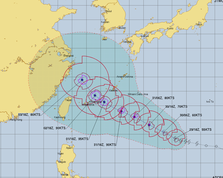 이후 9월 3일 경 진행각도를 북쪽으로 좀 더 틀어올릴 것으로 보입니다. JTWC의 예측을 기준으로 판단하면 최소 9월 3일까지는 우리나라 남해안에 직접 영향은 없을 것으로 보입니다.