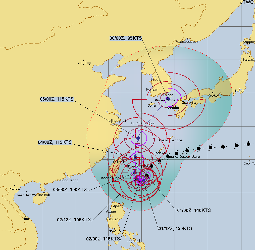미국합동태풍경보센터 JTWC의 예측도 일본기상청과 매우 비슷합니다. 역시 9월 5일 오전에 방향을 동쪽으로 살짝 틀어 대한해협을 향하게 되며, 6일 오전 9시 태풍의 중심이 대마도 상공에 위치할 것으로 전망하고 있습니다. 일본 기상청과 비교할 때 JTWC가 태풍의 이동속도를 다소 느리게 예상하고 있습니다.