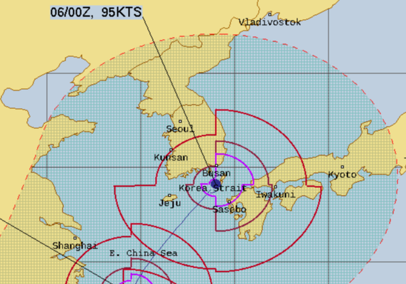 9월 6일 오전 9시에는 태풍의 중심이 대마도를 막 지나친 상황이 되며, 이 시기의 태풍의 위력은 중심기압 950헥토파스칼, 최대풍속 초속 40미터로 여전히 강한 태풍으로 남아있을 것 같습니다. 우리나라를 지나가는 태풍의 중심기압이 보통 980헥토파스칼 전후임을 고려한다면 950헥토파스칼의 태풍은 우리나라에 큰 피해를 줄 가능성도 있습니다.