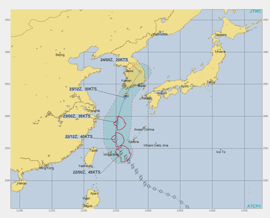 JTWC는 12호 태풍 오마이스가 제주도를 지나 전남 여수 인근에 상륙, 경상북도 내륙에서 소멸할 것으로 예상하고 있습니다.