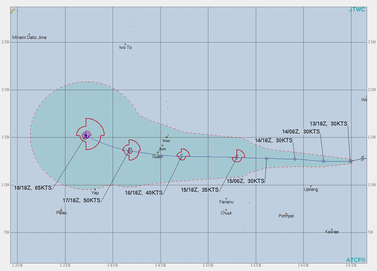 미국합동태풍경보센터의 8월 14일 오전 3시 발표 예보에 따르면 이 열대저압부는 8월 16일 오전 중에 12호 태풍 오마이스로 명명될 가능성이 높으며 괌을 통과하는 8월 17일 오후가 지나면 태풍의 머리를 북서쪽으로 들어 올리며 동남아시아 국가들을 향해 북서진할 것으로 보입니다.
