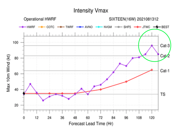 미국해양대기청 NOAA의 HWRF 예측에 따르면 12호 태풍 오마이스는 8월 19일 경, 허리케인의 등급을 나타내는 사피어 심프슨 스케일의 3번째 높은 단계인 카테고리 3에서 근접할 것으로 보여 만만치 않은 태풍이 될 가능성도 있습니다. 미국합동태평경보센터 JTWC는 8월 19일 경의 12호 태풍 오마이스의 강도를 카테고리 1 정도로 예상하고 있습니다. 이후 태풍 오마이스의 강도는 더욱 강해질 수도, 약해질 수도 있습니다.