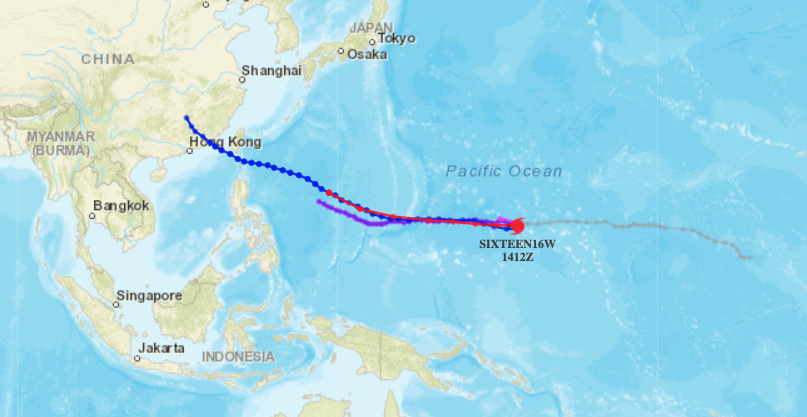 날짜변경선을 넘어와 생성된 열대저압부 TD16W가 서쪽으로 계속 이동 중이며 8월 16일, 12호 태풍 오마이스가 될 전망입니다.