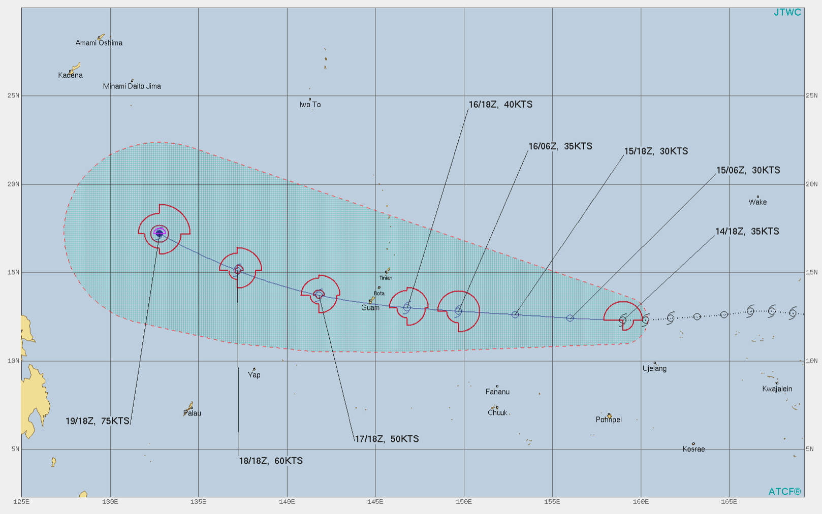 미국합동태풍경보센터 JTWC의 8월 15일 03시 발표 예보에 따르면 12호 태풍 오마이스의 이름을 아직 받지 못한 열대저압부가 미국령 괌을 향해 서쪽으로 이동 중이며, 8월 16일 중에 태풍의 기준이 되는 최대풍속 초속 17미터 (32노트)를 넘어서며 12호 태풍 오마이스로 명명될 가능성이 높습니다.