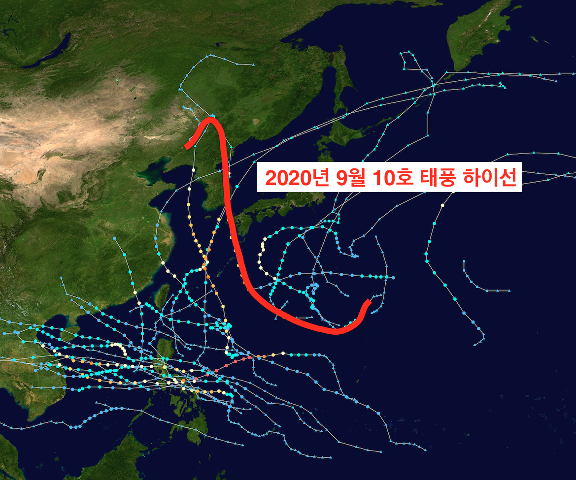 아래 태풍 사진과 이동경로는 작년 2020년 9월 태풍 하이선의 기록입니다. 9월 1일 발생하였고 9월 7일 오전, 울산 울주군에 상륙한 후 경상북도와 강원도 동해안 지역을 휩쓸고 올라갔습니다. 일본기상청 관측 기준으로 울주군 상륙 당시 중심기압이 955헥토파스칼 최대풍속 초속 35미터의 매우 강력한 태풍으로 기록되었습니다.