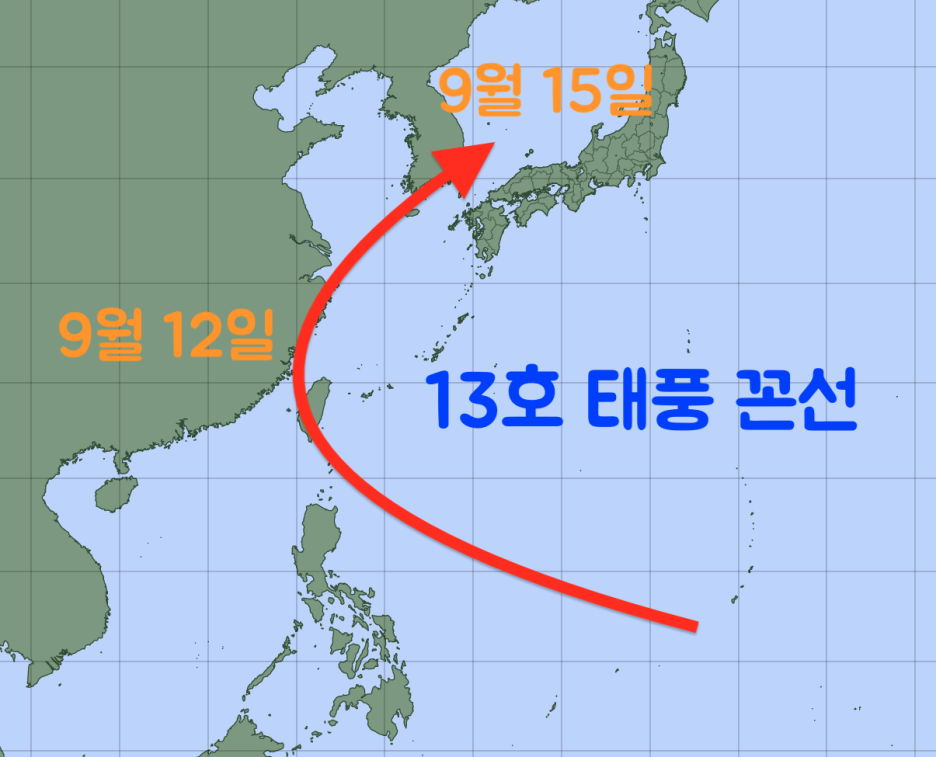 이 시나리오가 현실화된다면 우리나라가 13호 태풍 꼰선의 직접 영향권에 드는 시기는 9월 14일부터 15일까지입니다. 태풍이 직접 지나가는 지역은 제주도와 전라남도, 경상남도 연안 지역 그리고 부산이 될 것 같습니다. 물론 태풍의 크기는 늘 우리나라보다 크기 때문에 전국이 태풍의 직간접 영향권에 들 수도 있습니다.