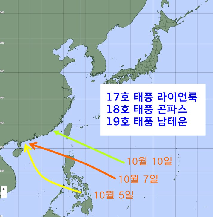 10월 5일 전후로 17호 태풍 라이언룩이 필리핀 남부에서 발생하여 중국 광동성을 향하고 10월 7일 경 필리핀 동부해역에서 18호 태풍 곤파스가 발생해 필리핀 북부 루손지역을 지나 역시 광동성으로 향할 전망입니다.