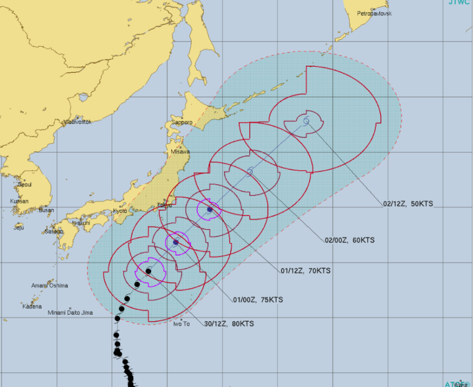 미국합동태풍경보센터 JTWC의 오늘 오전 예보에 따르면 태풍 민들레는 오늘 (10월 1일) 오후 6시 경 도쿄에 가장 근접한 위치를 지나며 동북쪽 방향으로 이동할 것으로 예상됩니다.