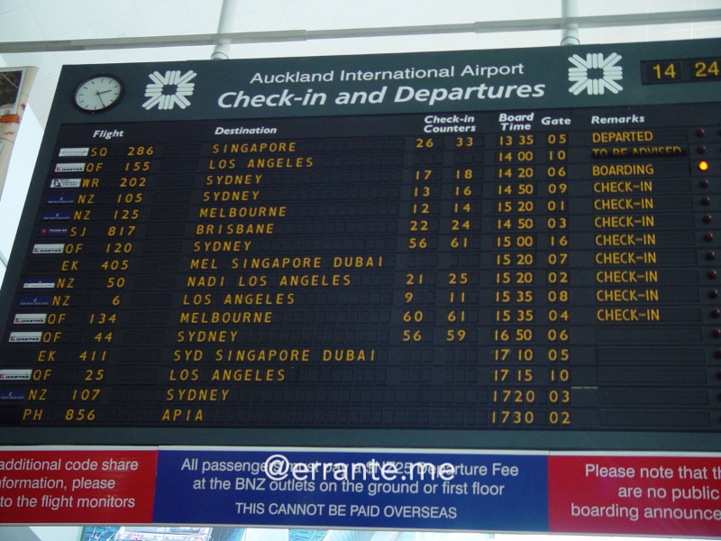 오클랜드 공항의 국제선 출발 전광판입니다. 시드니, 멜버른, 브리스번 같은 왕래가 많은 호주의 도시들로 가는 비행 편에 많이 보입니다. 콴타스항공의 로스앤젤레스 향 비행기는 아마 시드니를 출발해 오클랜드를 거쳐 태평양 너머 LA로 가는 것 같네요. 에어뉴질랜드는 피지의 수도 난디를 경유해 LA로 가는 노선입니다. 에미레이트항공은 당시 멜버른과 싱가포를 거쳐 두바이까지 가는 노선을 운영했던 모양입니다. 맨 아래 퍼시픽항공은 서사모아의 수도 아피아로 가는 항공편입니다.