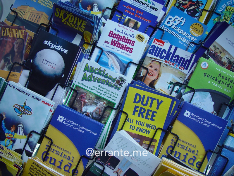 세계적 관광지이자 도시 주변에도 볼 거리가 많은 도시답게 공항버스 안에는 여행지 브로슈어가 가득합니다. 호텔, 호스텔, 크루즈 브로슈어도 있고 숙소 위의 스카이타워에서 번지점프를 하는 프로그램도 있습니다. 반딧불이가 사는 와이토모 동굴로 가는 여행상품도 있습니다.
