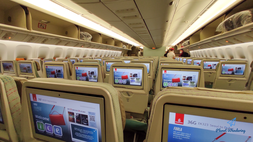 에미레이트항공 보잉777의 일반석 모습입니다. 3-4-3열 배치이며 나름 쾌적한 공간을 자랑합니다. 개인형 모니터의 크기를 보면 옵션이 잘 들어온 비행기라는 걸 알 수 있습니다.