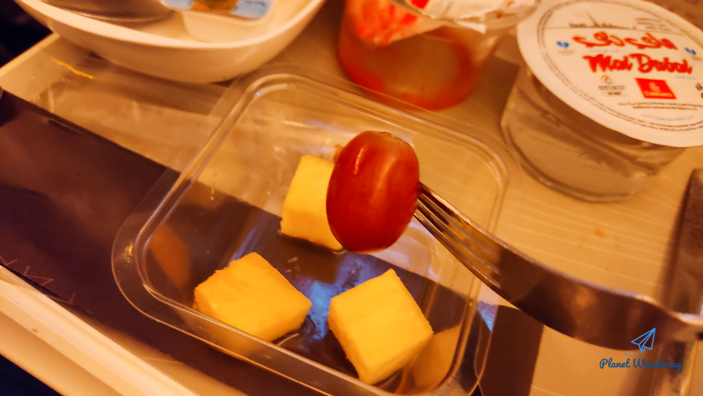 기내식에 따라 나오는 과일은 에미레이트항공 비즈니스라운지에 있는 과일과 똑 같습니다. 수박, 멜론, 파인애플이 있고, 포도 종류인 이것의 정확한 이름은 모르겠네요. 에미레이트항공 기내식의 과일을 드실 때는 수박 멜론 포도 파인애플 순으로 드시는 게 좋습니다. 과일 맛이 강해지는 순으로 드셔야 각 과일의 맛을 제대로 느낄 수 있으니까요.