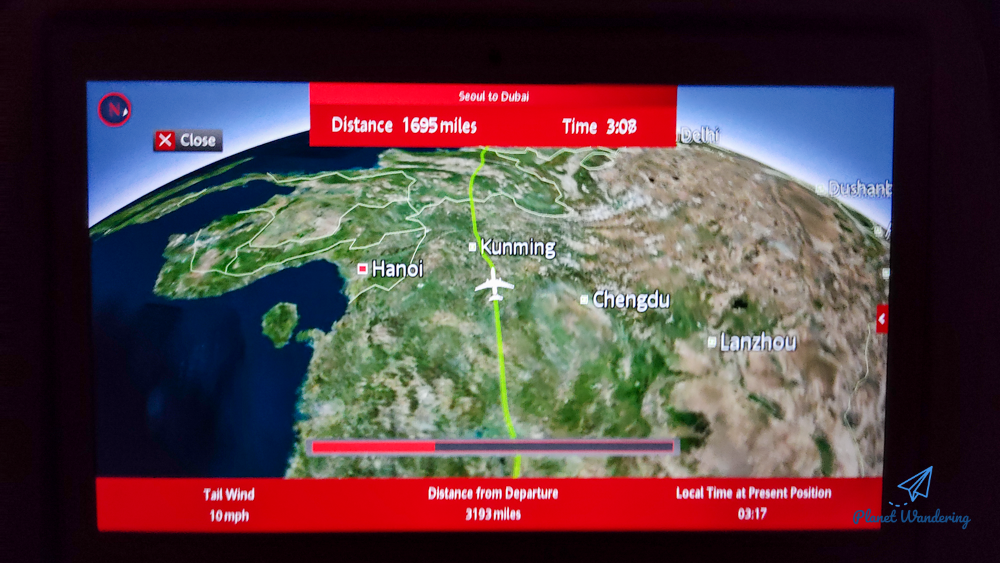 에미레이트항공의 보잉777은 세부 기종이 대락 3가지가 있는데 이 기종은 개인 모니터가 크게 붙은 '중간 옵션'의 비행기로 보입니다. 손바닥만 한 모니터가 있는 낮은 옵션의 777도 있고, 큰 모니터와 함께 자리마다 리모컨, 220V 전원, USB 전원을 모두 사용할 수 있는 높은 옵션의 기종도 있습니다.