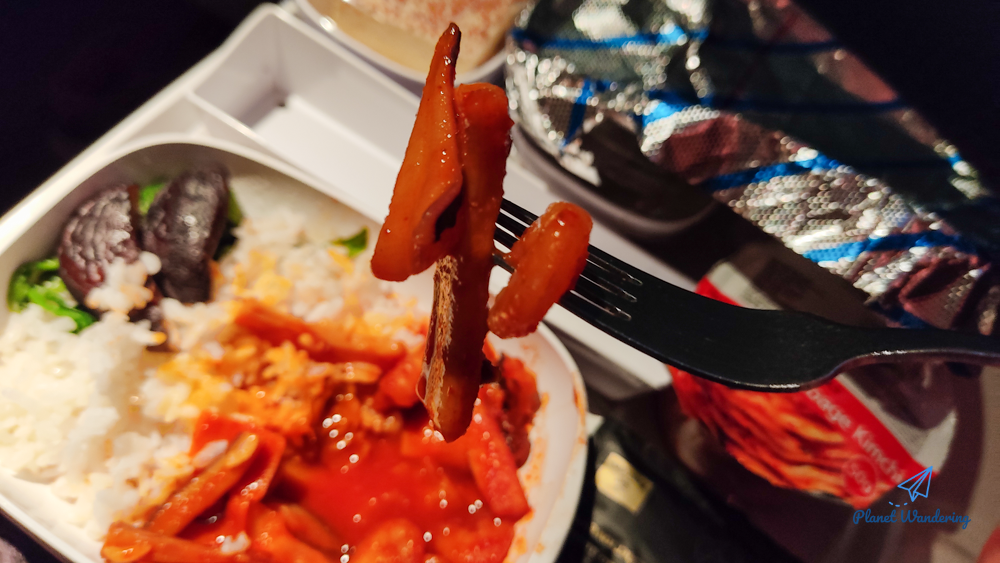 맛을 묘사하자면, 시장 떡볶이 양념에 오징어를 볶은 느낌입니다. 매운 맛이 좀 날카롭기는 했는데 달콤 매콤한 양념으로 만든 오징어 덮밥을 먹는 느낌 그대로입니다. 오징어 양도 많고 버섯도 탱탱한 게 맛이 좋았습니다. 기내에서 먹기 힘든 메뉴를 먹게 된 것 같아 좋네요!