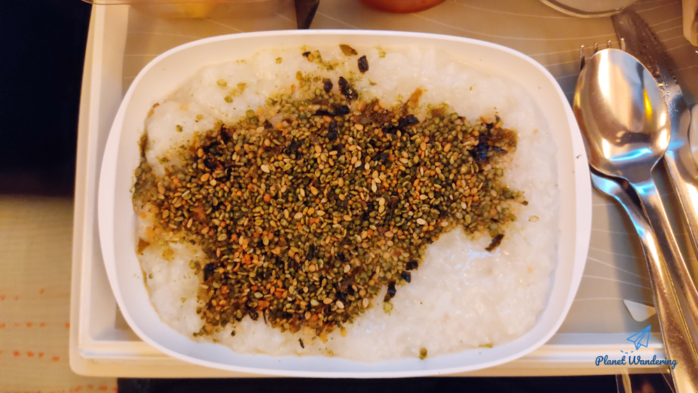 소금을 더 넣지 않아도 될 정도로 간이 적당한 죽을 깨와 양념가루를 잘 섞어 드시면 피곤한 밤 비행의 마무리 아침식사로 괜찮습니다. 아침식사에 매운 김치는 약간 부담스럽기는 한데, 조금은 밋밋하게 느껴지는 죽 맛에 포인트를 더해주기는 하죠.