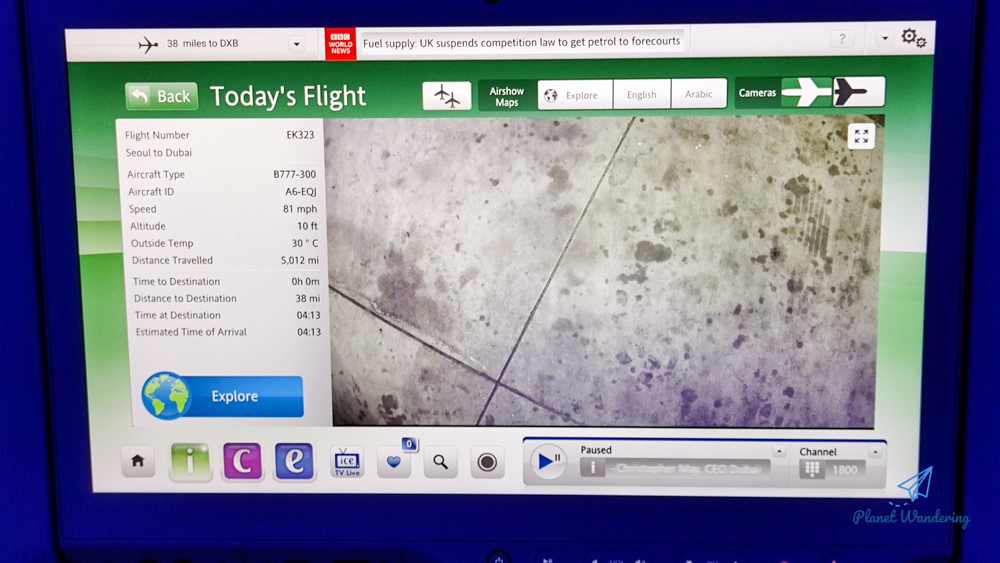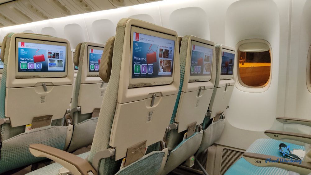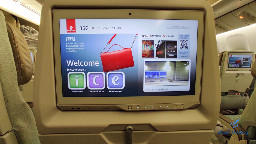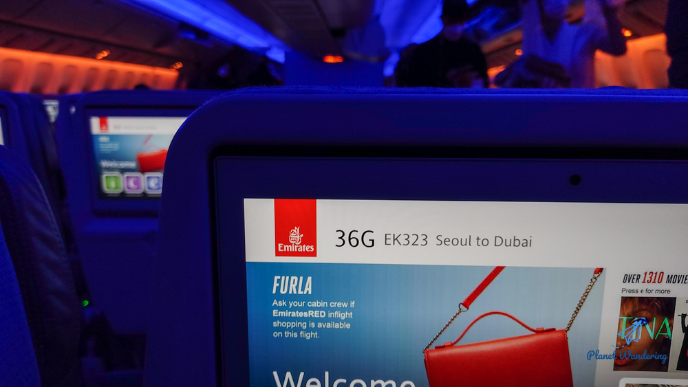 에미레이트항공의 보잉777은 세부 기종이 대락 3가지가 있는데 이 기종은 개인 모니터가 크게 붙은 '중간 옵션'의 비행기로 보입니다. 손바닥만 한 모니터가 있는 낮은 옵션의 777도 있고, 큰 모니터와 함께 자리마다 리모컨, 220V 전원, USB 전원을 모두 사용할 수 있는 높은 옵션의 기종도 있습니다.