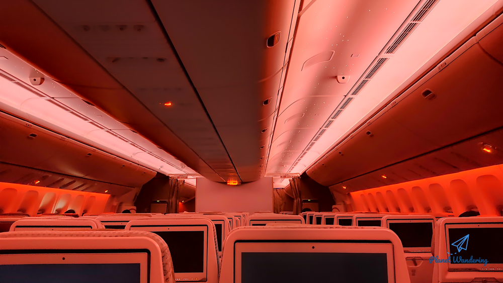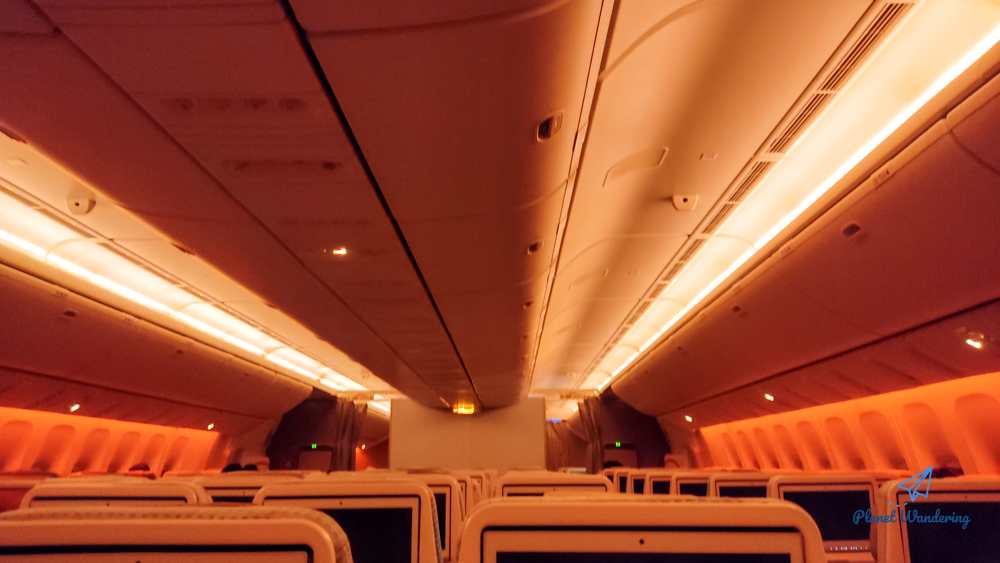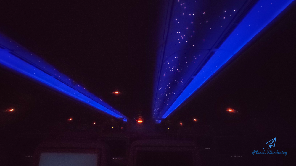 승무원 입장에서는 밥을 주고 식기를 회수하면 큰 이벤트 하나를 끝낸 셈입니다. 객실의 조명을 최대한 낮추고 승객들이 잠들 수 있는 분위기를 만들어줍니다. 우리나라 시간으로는 새벽 1시 넘어 야식을 거하게 먹고 잠이 슬슬 오는 시간대입니다.