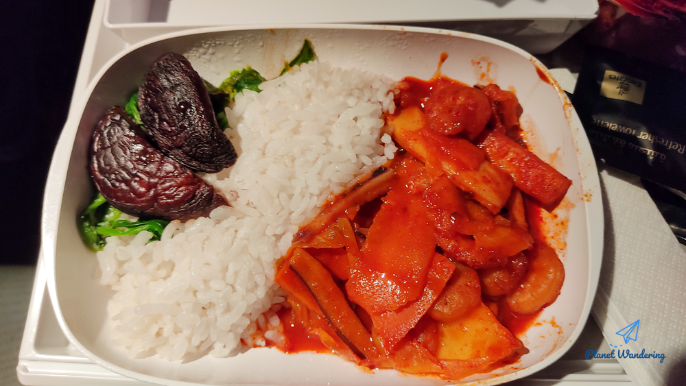 짠~ 밥뚜껑을 열었더니,, 음.. 시푸드 해산물 요리라기보다는 매운 오징어덮밥이네요. 왼쪽의 군밤처럼 생긴 건 버섯입니다. 매우 한국적인 음식이라,, 시푸드를 선택한 외국인 승객들 걱정이 먼저 드네요.
