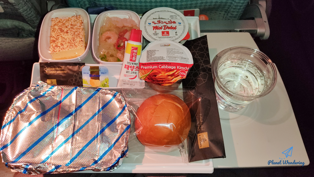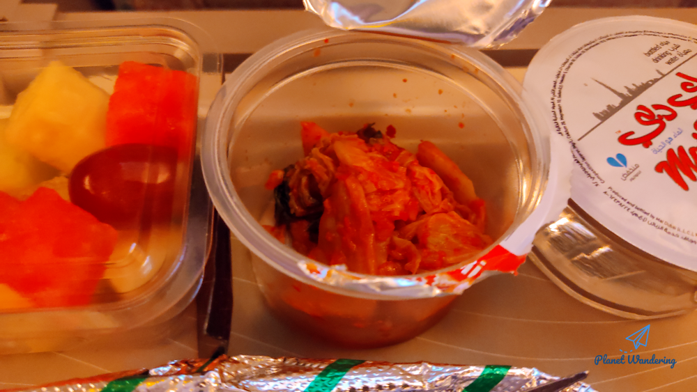 이 날은 평소 못 들어본 메뉴인 시푸드를 선택했는데요, 김치가 함께 따라나오고 고추장은 배식 카트 위에 있는데 달라고 해야 주는 분위기입니다. 튜브 고추장은 꼭 기내에서 사용하지 않더라도 여행지에서 쓸데가 있죠.