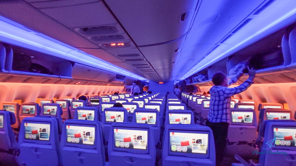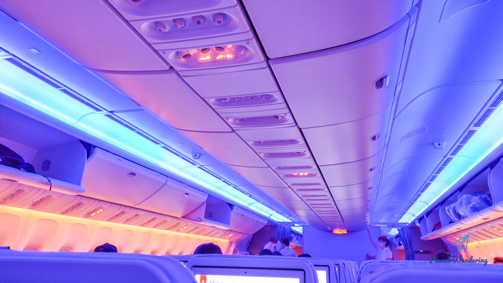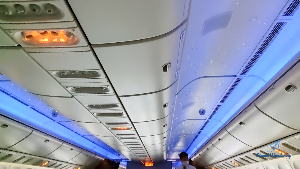 출항 준비를 거의 마친 기내, 정말로 비어있는 자리가 많습니다. 기억을 못 하는 걸 수도 있겠지만 예전과 다르게 느껴진 점은 배경 조명이 인상적이라는 부분입니다. 예전에는 비행기 천장에 촘촘하게 박혀있는 별 장식을 보는 게 전부였던 것 같은데, 푸르스름한 불빛이 나름 분위기를 내주네요.