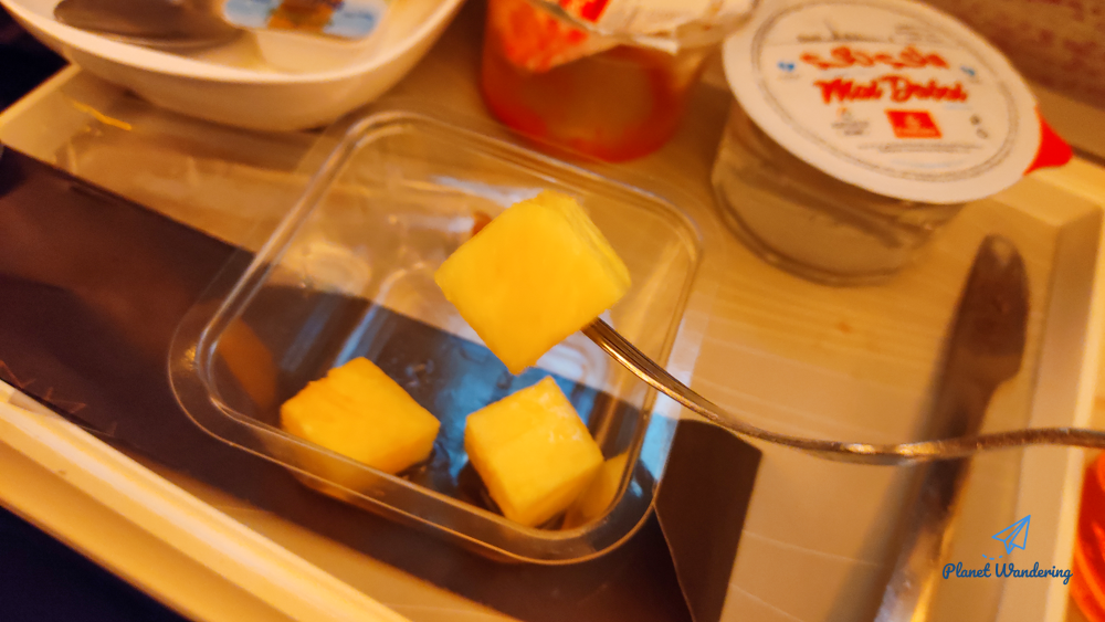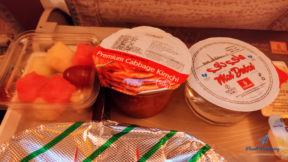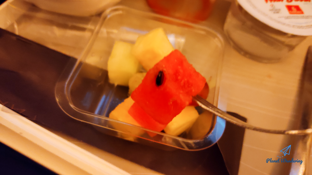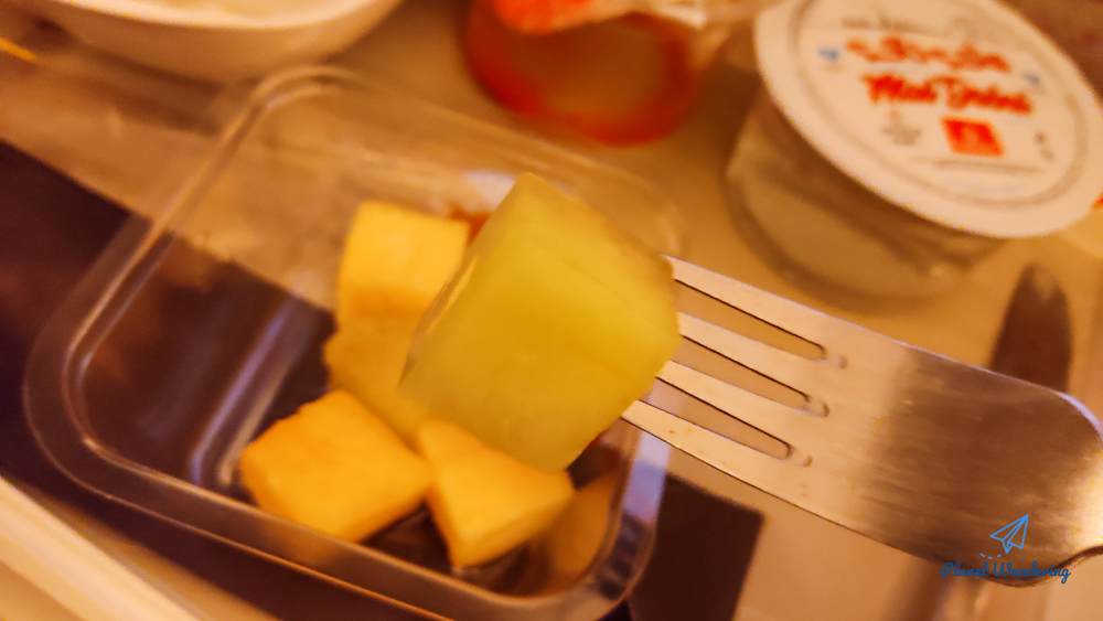 기내식에 따라 나오는 과일은 에미레이트항공 비즈니스라운지에 있는 과일과 똑 같습니다. 수박, 멜론, 파인애플이 있고, 포도 종류인 이것의 정확한 이름은 모르겠네요. 에미레이트항공 기내식의 과일을 드실 때는 수박 멜론 포도 파인애플 순으로 드시는 게 좋습니다. 과일 맛이 강해지는 순으로 드셔야 각 과일의 맛을 제대로 느낄 수 있으니까요.