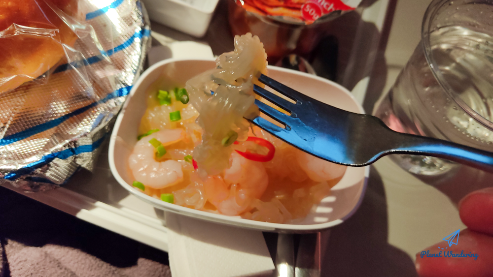 빵에 온기를 전달하는 와중에 전체요리를 먼저 먹어봅니다. 2018년부터 지금까지 에미레이트항공을 타고 에티오피아를 6번 왕복했고 이번이 7번째인데, 그동안에 못 보던 메뉴입니다. 느낌으로는 해파리 새우 냉채인데,, 서양 사람들이 해파리를 먹지는 않을 테고,, 나중에 찾아보니 무슨 면 종류이긴 하네요. 맛은 마음에 쏙 들었습니다. 새우도 탱글탱글하고 딱 해파리냉채 맛이네요.