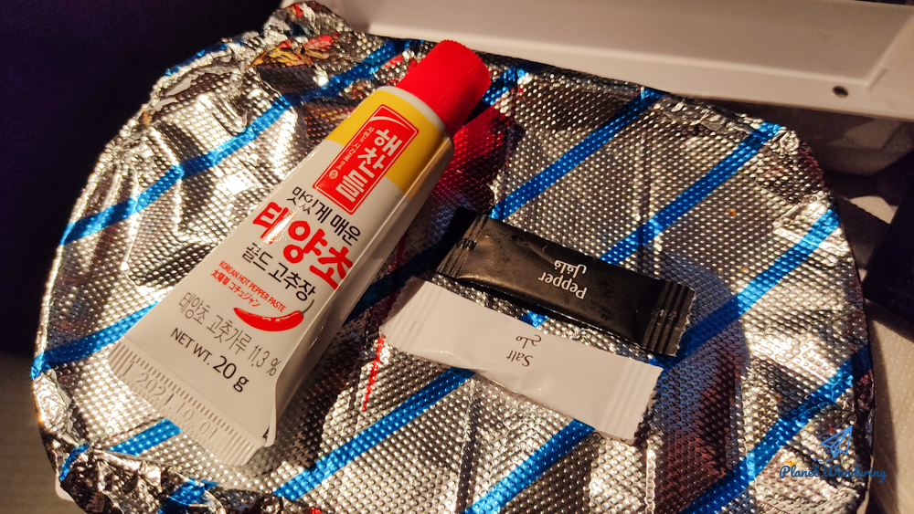 밥뚜껑을 열기 전, 고추장과 소금 후추는 여행 중 별미를 만들 때 쓰기 위해 가방 안으로 쏙 넣어둡니다. 기내에서 받는 어메니티 파우치나 마스크, 고추장, 그리고 식사시간 외에 먹으려고 기내식 트레이에서 빼두는 과자류나 생수는 좌석 앞 주머니에 모아두거나 면세점 쇼핑백, 작은 가방 같은 걸 좌석 아래 놓아두고 넣어두면 편리합니다.