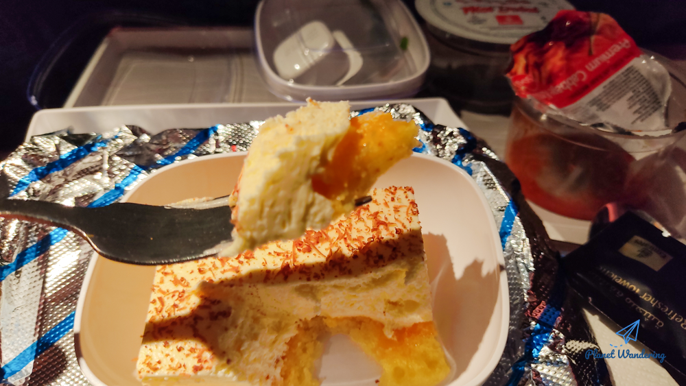 밤에 먹기 약간 부담스러운 매운 맛을 달콤한 무스 케이크로 살살 달래 봅니다. 이 녀석은 여러 번 먹어본 맛인데 언제 먹어도 맛이 있죠. 밥을 먹고 스프라이트를 한잔 마시고 커피는 사양했습니다. 방랑객은 커피보다는 거품 나는 음료수를 좋아하죠. 에미레이트항공의 커피는 약간 태운 숭늉처럼 구수한 맛이 나는데 맛은 좋습니다.