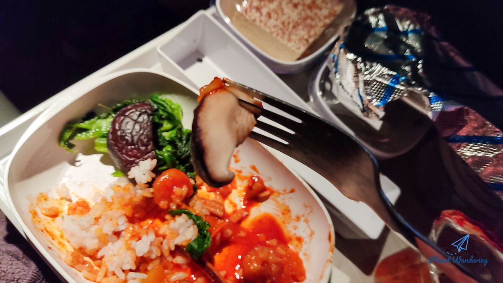 맛을 묘사하자면, 시장 떡볶이 양념에 오징어를 볶은 느낌입니다. 매운 맛이 좀 날카롭기는 했는데 달콤 매콤한 양념으로 만든 오징어 덮밥을 먹는 느낌 그대로입니다. 오징어 양도 많고 버섯도 탱탱한 게 맛이 좋았습니다. 기내에서 먹기 힘든 메뉴를 먹게 된 것 같아 좋네요!
