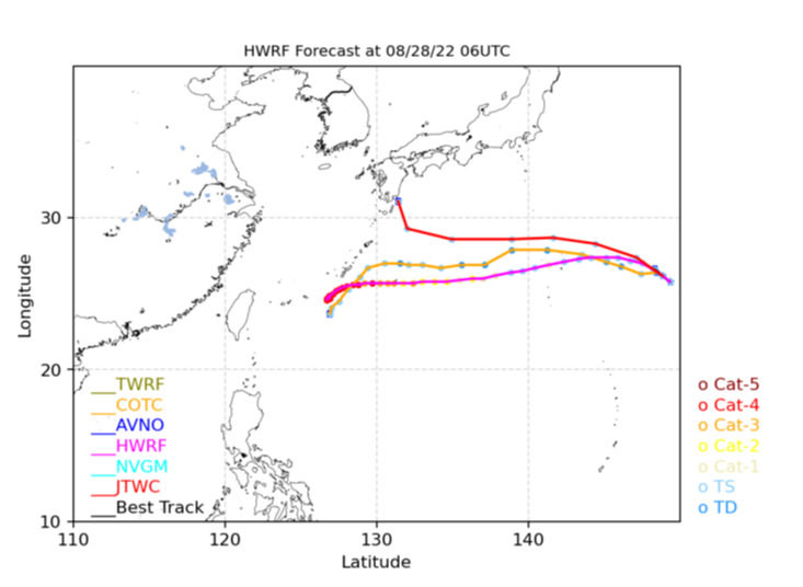 미국해양대기청 NOAA가 제공하는 태풍예측모델들의 예측 상황을 보면 역시 예측이 제각각임을 알 수 있습니다. 태풍 힌남노가 일본 큐슈에 상륙할 것이라는 JTWC의 예측과 달리 2개의 예측모델은 일본 기상청의 예측과 유사한 방향으로 진행하나, 일본 기상청의 예측과 달리 오키나와 남쪽 해역으로 진출할 것으로 보고 있습니다.