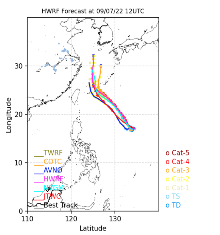 미국합동태풍경보센터 JTWC도 일본기상청과 유사한 형태의 12호 태풍 무이파 예상진로를 내놓고 있습니다. JTWC에 따르면 12호 태풍 무이파는 북서쪽으로 직선에 가까운 이동을 이어가며 9월 12일 오전에는 일본 영토이지만 타이완 본토에 더 가까운 야에야마제도의 미야코섬을 지나, 9월 13일에는 상하이 남동쪽 해역까지 진출할 것으로 전망하고 있습니다.