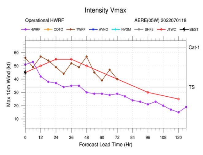 미국합동태풍경보센터 JTWC, 일본기상청 JMA 모두 유사한 태풍 에어리의 진로를 제시하고 있습니다. 4호 태풍 에어리가 우리나라에 영향을 주는 시기는 7월 5일 오전부터 7월 6일 오전까지로 예상되며 제주도와 남해안, 부산 인근 해역이 태풍 직
