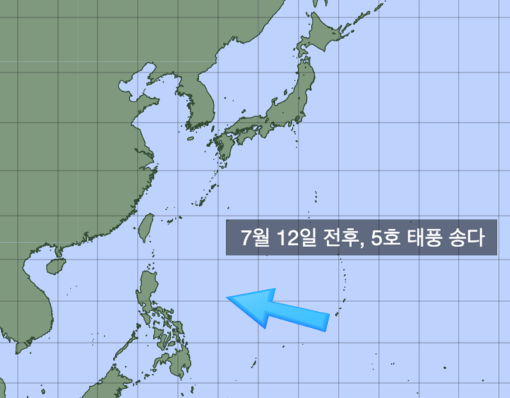한편 7월 12일을 전후해, 괌이 있는 마리아나제도 인근 해역에서 5호 태풍 송다의 발생 가능성이 있습니다. 마리아나제도 주변 해역은 태풍이 태어나고 강력하게 성장하는데 아주 좋은 환경이기 때문에 5호 태풍 송다는 제법 큰 태풍으로 발달할 수 있습니다. 태풍의 진로 또한 어느 방향으로든 막힘없이 진로가 열려있어 우리나라에 영향을 줄 가능성도 없다 할 수는 없는 상황입니다.
