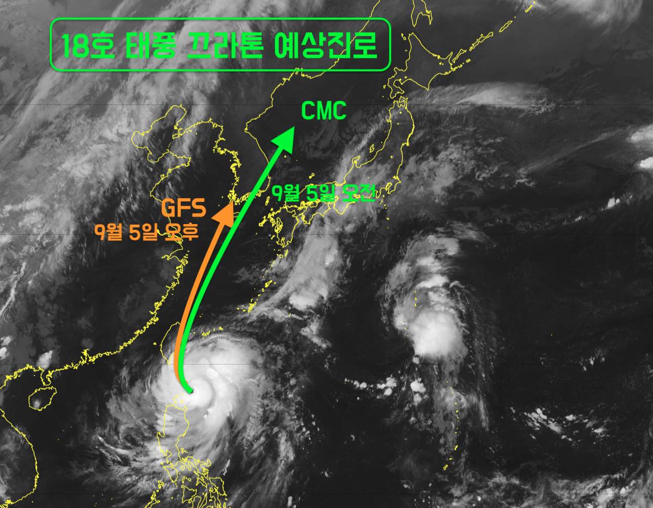 우리나라 남부지방 상륙 시점  -  GFS모델 : 9월 5일 오후    /   CMC모델  : 9월 5일 오전