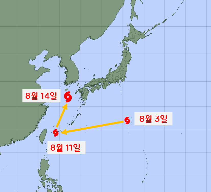 아직 보름이 넘게 남은 후일의 상황이므로 태풍의 발생 상황을 관심있게 지켜봐야겠습니다. 8월 14일~15일에 영향을 미치는 태풍 예측 외에 8월 초에는 태풍의 영향은 없을 것으로 보입니다.