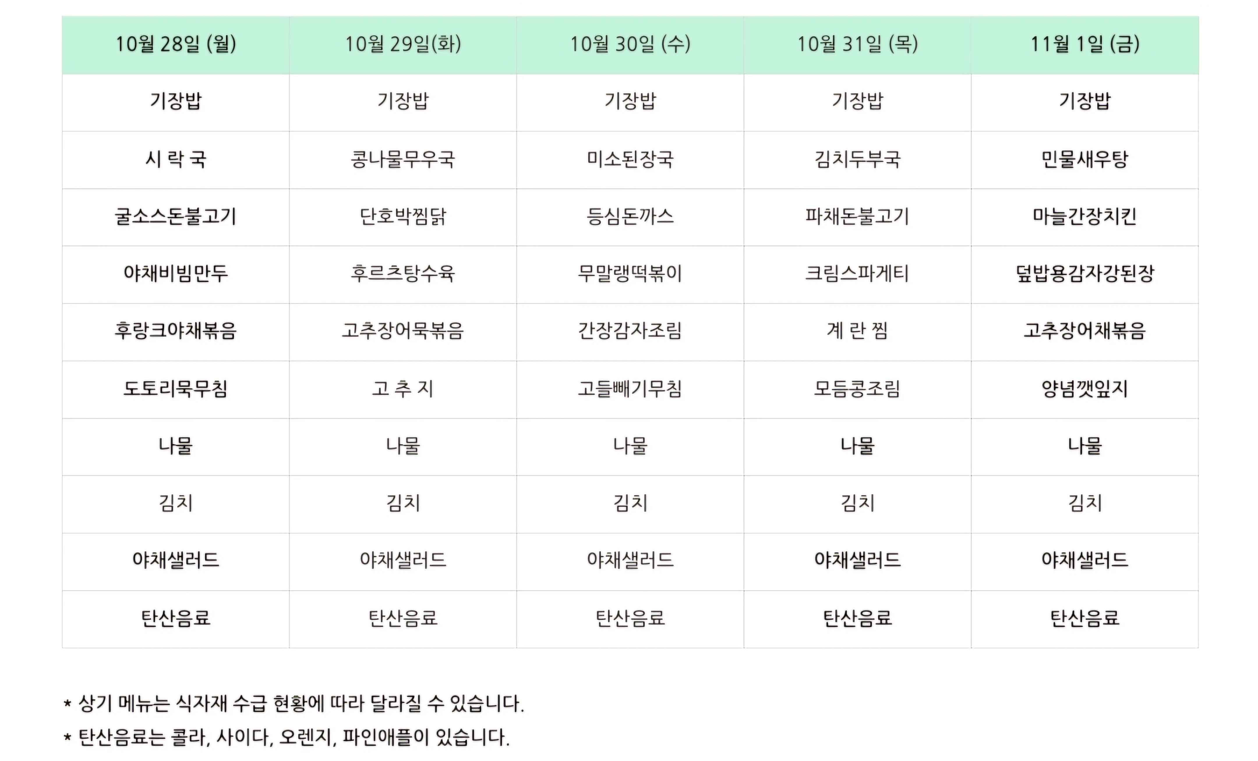 센텀시티 구내식당 식단표 2024년 [10월 28일 - 11월 1일] 주간